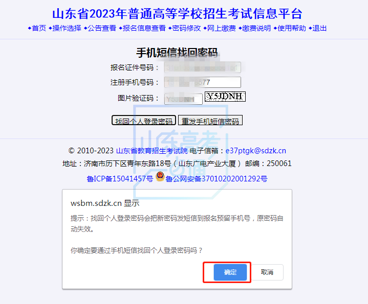 填写报名证件号码、注册手机号码、图片验证码,点击确定按钮。如下图: