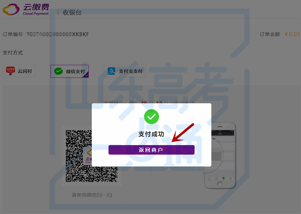 2.银联商务支付平台(青岛市考生缴纳春、夏季报名考试费):点击网上缴费→打开手机云闪付、微信、支付宝扫描缴费二维码→手机支付成功、点击“完成”→手机上点击“返回商户页面”返回报名系统→电脑点击“手机支付已完成”→刷新页面→查看缴费结果→报名网站显示缴费成功。
