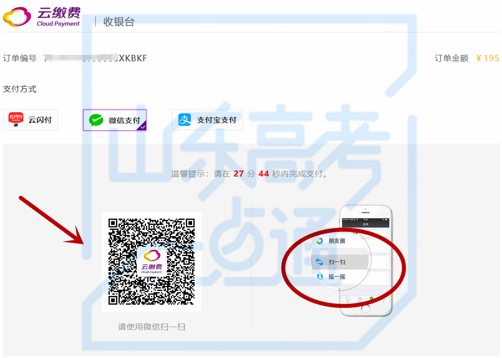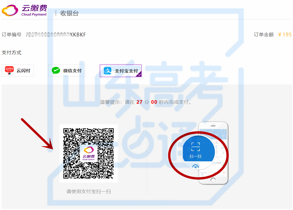 该页面上半部分是考生缴费订单信息,包括:订单编号、订单金额等;下半部分是可以选择支付方式:包括:云闪付、微信支付、支付宝支付。