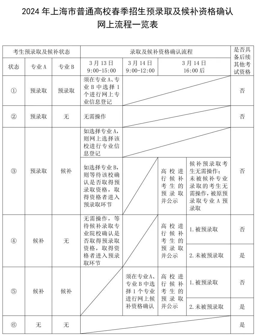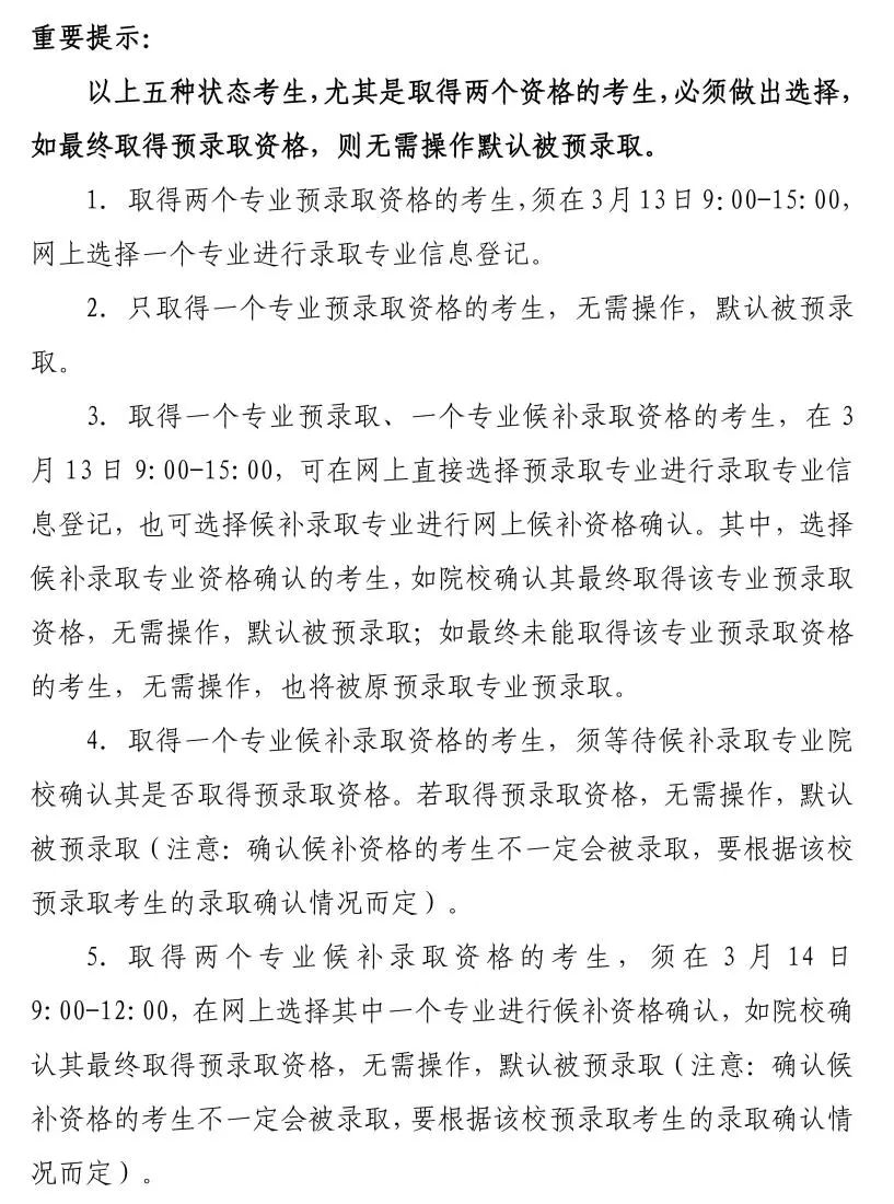 3.取得两个专业候补录取资格的考生,须在3月14日9:00-12:00,在网上选择一个专业进行候补资格确认,如院校确认最终取得预录取资格,默认被预录取,无需操作。