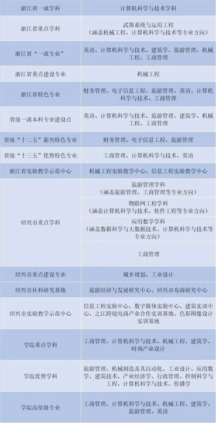 学院坚持以教学为中心,深化改革,强化实践,通过星级专业建设、专业自主招生等一系列措施,教学质量稳步提高,专业特色初步显现。2015年,计算机科学与技术被评为浙江省一流学科。2019年,工商管理被评为绍兴市普通高校重点学科。建筑学、旅游管理、英语、计算机科学与技术、机械工程等入选浙江省“一流专业”。