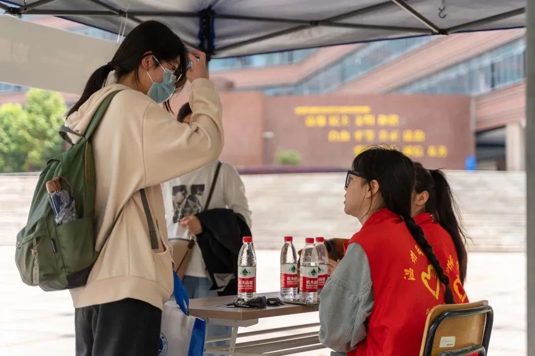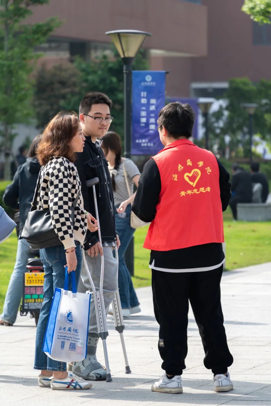 为方便广大家长停车,我校开辟了一个专用停车场。来自嘉兴的许家长说,车子到达校门口,就发现有很多志愿者在提供引导服务,一切都很有秩序。进入校园还有摆渡车接送,这是平生第一次体验。之前他就听过温商院有“最优服务学生”的说法,今天实地感受之后,果然名不虚传!偌大的校园里,除了考生和家长,处处可见身穿红马甲的志愿者们。来自宁波的徐同学16日上午踏入温商院,第一感觉就是校园空间很大,她说如果没有志愿者提供引路服务,自己很可能会在校园迷路。校园里,随处可见一些家长在近水台、创业桥、榕池等校园十景打卡留念。来自绍兴的周同学的家长说,一路漫步都能看到志愿亭和脸上写满微笑的红马甲,可见这所学校很注重爱心教育。如果孩子能够顺利考上温州商学院,做家长的肯定非常开心,也非常放心。在体育馆一楼门口,一位2020年通过“三位一体”综合测试考入学校的袁同学正在为家长和考生提供志愿服务,通过自己将爱心继续传递。
