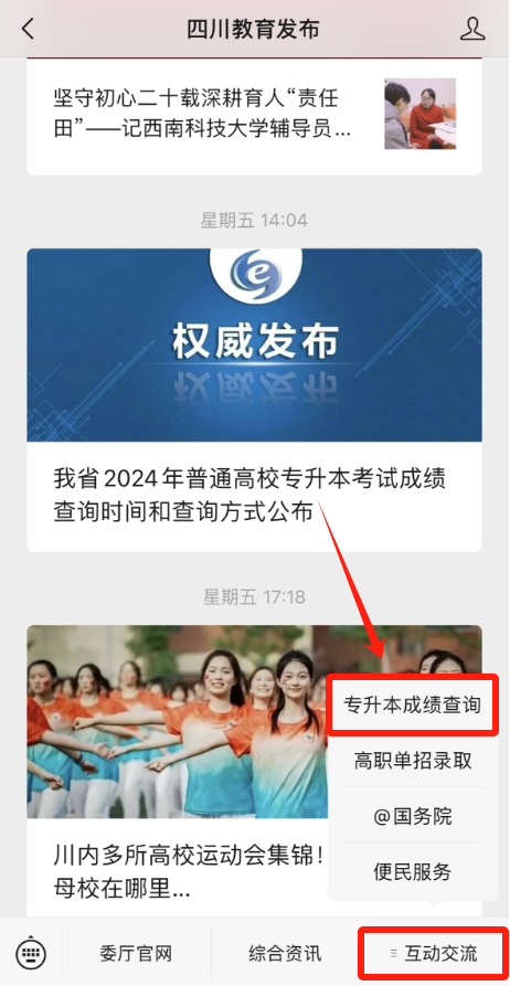 考生朋友们我省2024年普通高校专升本考试成绩查询通道将于今晚(4月22日)20:00开启关注“四川教育发布”微信公众号点击“互动交流”查询成绩也可点击下方链接直接查询成绩↓↓↓2024年普通高校专升本考试成绩查询祝大家都能考高分▌本文来源:四川教育发布更多新闻“101计划” 来了!一大波招聘来了!抓紧报名一个人最大的教养藏在这3句话里本周上班时间有变!