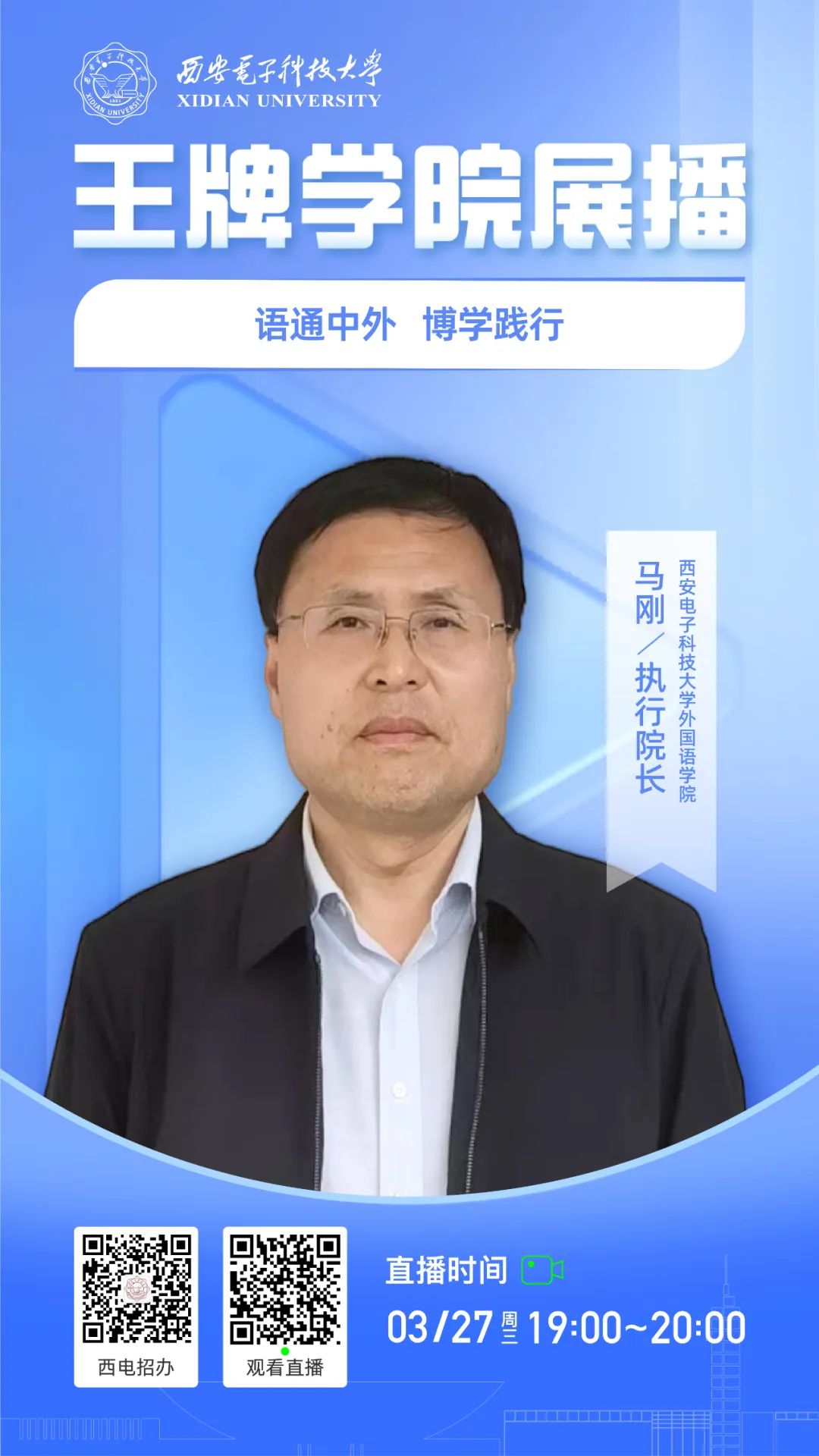 2024“王牌学院展播”活动第八期将于3月27日(星期三)开讲!本期邀请到西电外国语学院执行院长马刚,带我们解读外国语的奥秘,欢迎各位家长及考生关注~