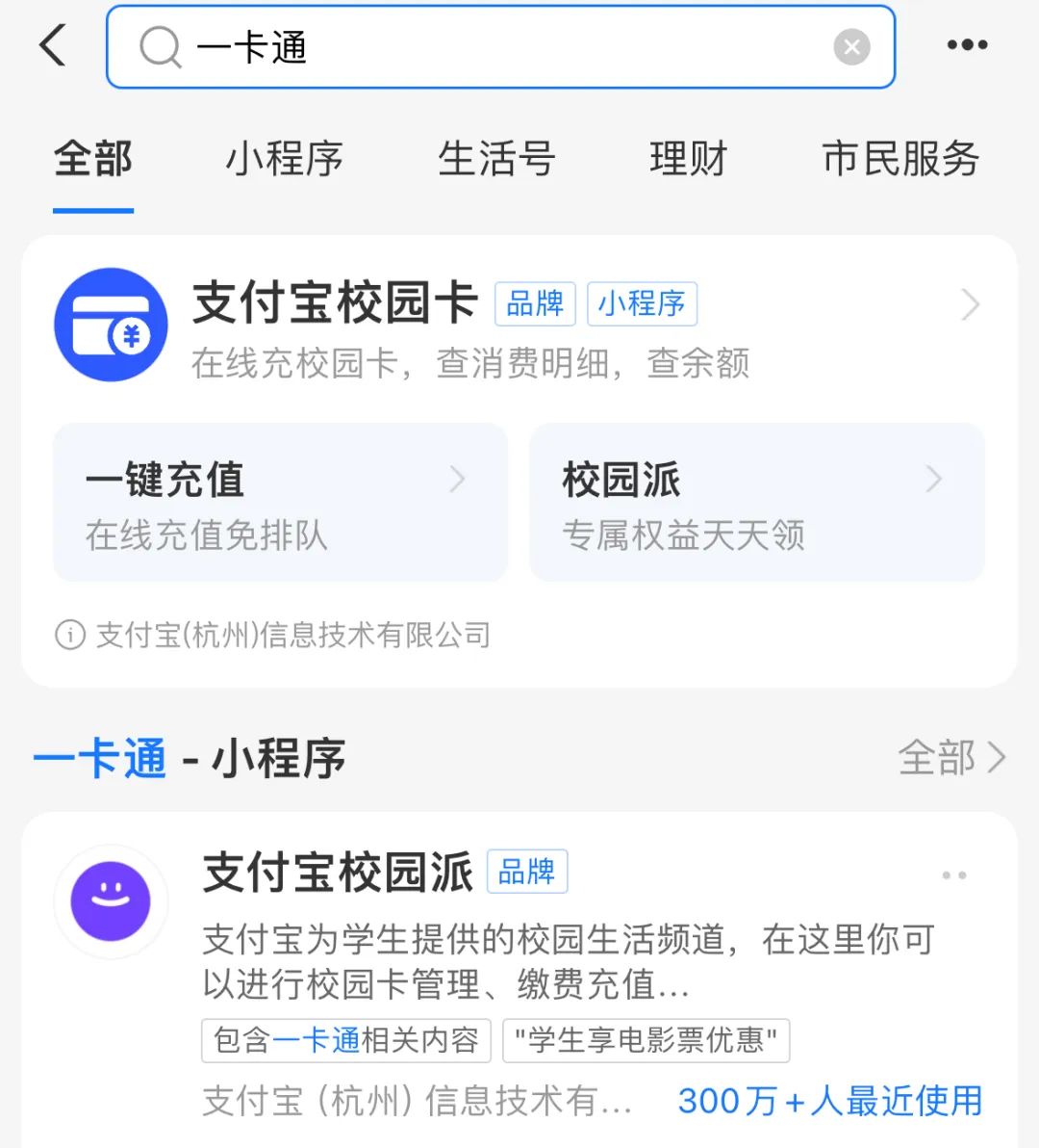 首先在手机上打开支付宝app,搜索“一卡通”,首次圈存需要在充值页面选择相应学校填写卡号和姓名,这里的卡号要填写学号,然后输入充值金额。如果学校有两个校区且在不同城市,一般选择主校区所在城市。短信通知填写充值成功后短信提示发送的手机号码。