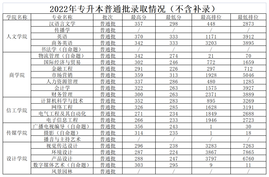 2022年普通专升本(普通批次)各专业录取最低分及排位