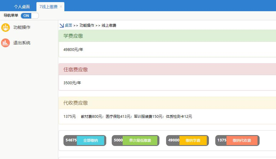 新生通过手机扫描二维码仔细阅读“缴费指引”后进行缴费。新生报到注册前应缴费用=学费+住宿费+代收费(教材费、居民城乡医保、军训服装费、体质检测卡费)。