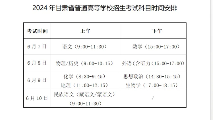 6月5日,甘肃省教育考试院发布的《2024年甘肃省普通高等学校招生工作规定》明确,普通高考将于6月7日至10日进行,高考成绩于6月25日左右公布。全省各批次各类别录取分数线一次确定,一次公布。第一次志愿填报时间为6月26日20:00至6月30日14:00,第二次填报时间为7月29日20:00至7月31日14:00。普通高考录取7月6日开始,8月15日结束。