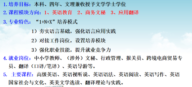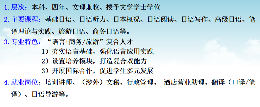 外国语学院按照学校“地方性、应用型、开放式”的办学定位,始终以提升本科教学质量为目标,坚持“三基并重(知识、能力、素质)、三段培养(基础、拓展、强化)”的原则,充分发挥语言优势,以“双创引领、教赛相融、‘语言+’服务地方”为抓手,着力培养“语言基础扎实、专业特色鲜明、职业技能突出,一专多能”的复合型、应用型外语人才。现有英语、日语、酒店管理三个本科专业,目前学院全日制在校学生1500余人。
