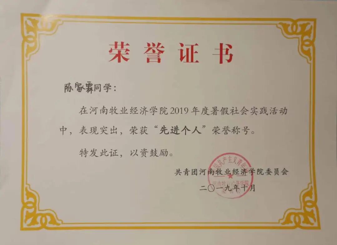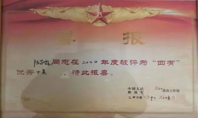 荣获 “先进个人” 荣誉称号2019年9月,参军入伍