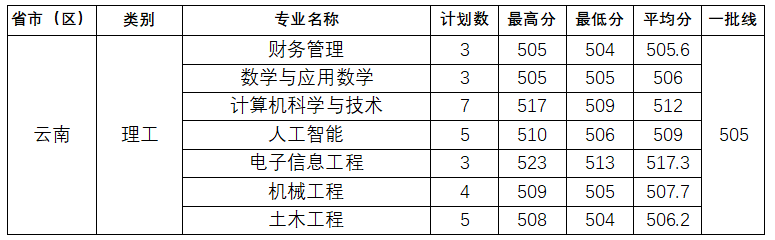 我校在云南省二本执行理工计划30人,满额录取30人,最高分523,投档分504。具体情况如下: