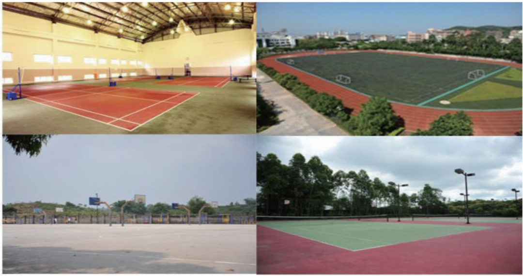 体育活动场所:体育设施完备,拥有各类体育场所和体育器材。运动场地面积达25689平方米。现有标准人造草塑胶跑道运动场(包括足球场和400米环形跑道)1个、篮球12个、网球场2个、室外乒乓球桌4张、室外羽毛球场13个、体育馆(室内羽毛球场地、乒乓球场地)、排球场2个。尚品书院楼(3个羽毛球场、3个室内乒乓球场),具体分布请看学校地图网址。