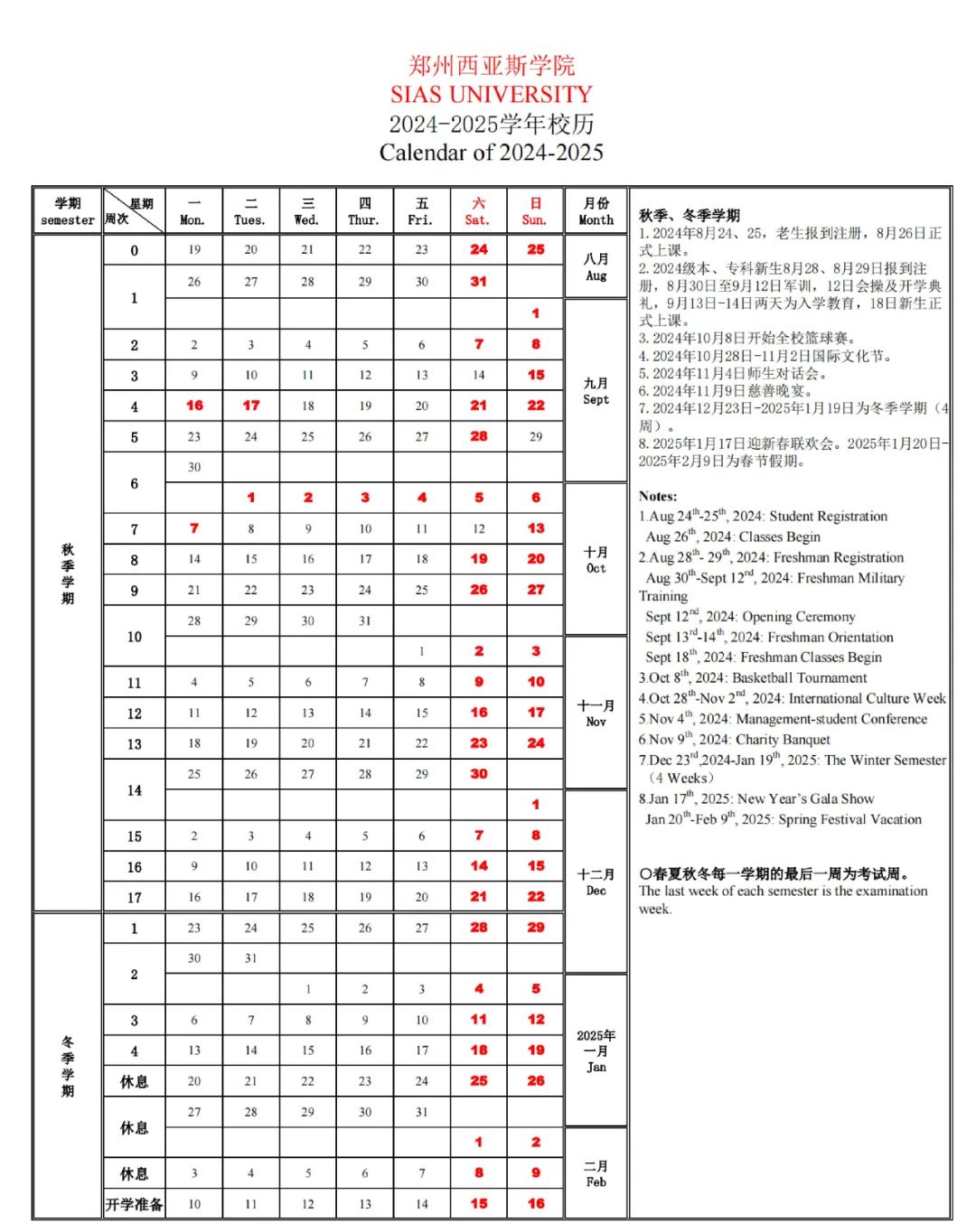 2024-2025学年秋、冬学期校历新鲜出炉