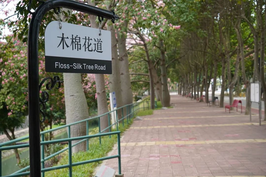 丝木棉(学名异木棉)为我校校花,建校伊始沿流溪河灌渠两岸种植300余株丝木棉,渐成学校一景。灌渠西岸一侧,原博学路、香径路边丝木棉树挺拔,在默默汲取三季养分后,遇冷而开,迎寒怒放,色艳无香,柔若云霞。它象征着广软学子孜孜不倦的学习态度,敢为人先的创业精神,绚烂繁华的人生道路,故命名为“木棉花道”。该路起于心桥,止于旧南门“菜鸟驿站”。