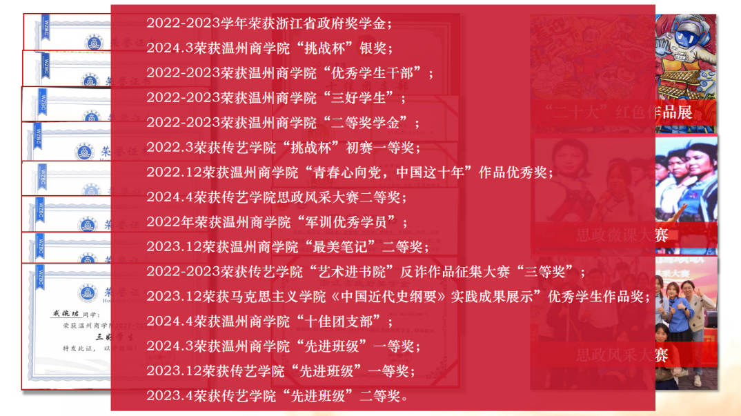 自入校以来,戚婉珺积极向党组织靠拢,成为了同届学生当中第一批中共预备党员,学业上一直名列前茅,其中在2023-2024学年度专业排名第一,先后获得浙江省政府奖学金、校优秀学生二等奖学金、校优秀学生干部、校三好学生等20余项奖项。作为一名青年党员,能够将所学专业与实践结合,创立了“了不起的海岛ip+红色教育”的新型宣传模式。积极参加思政微课、思政风采大赛,荣获校思政微课大赛二等奖。