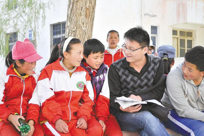 2014年,“格桑花”支教队员王松(右二)课间与藏族学生交流。