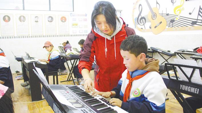 2024年11月,“格桑花”支教队员周志超在教孩子们学电子琴。 (
