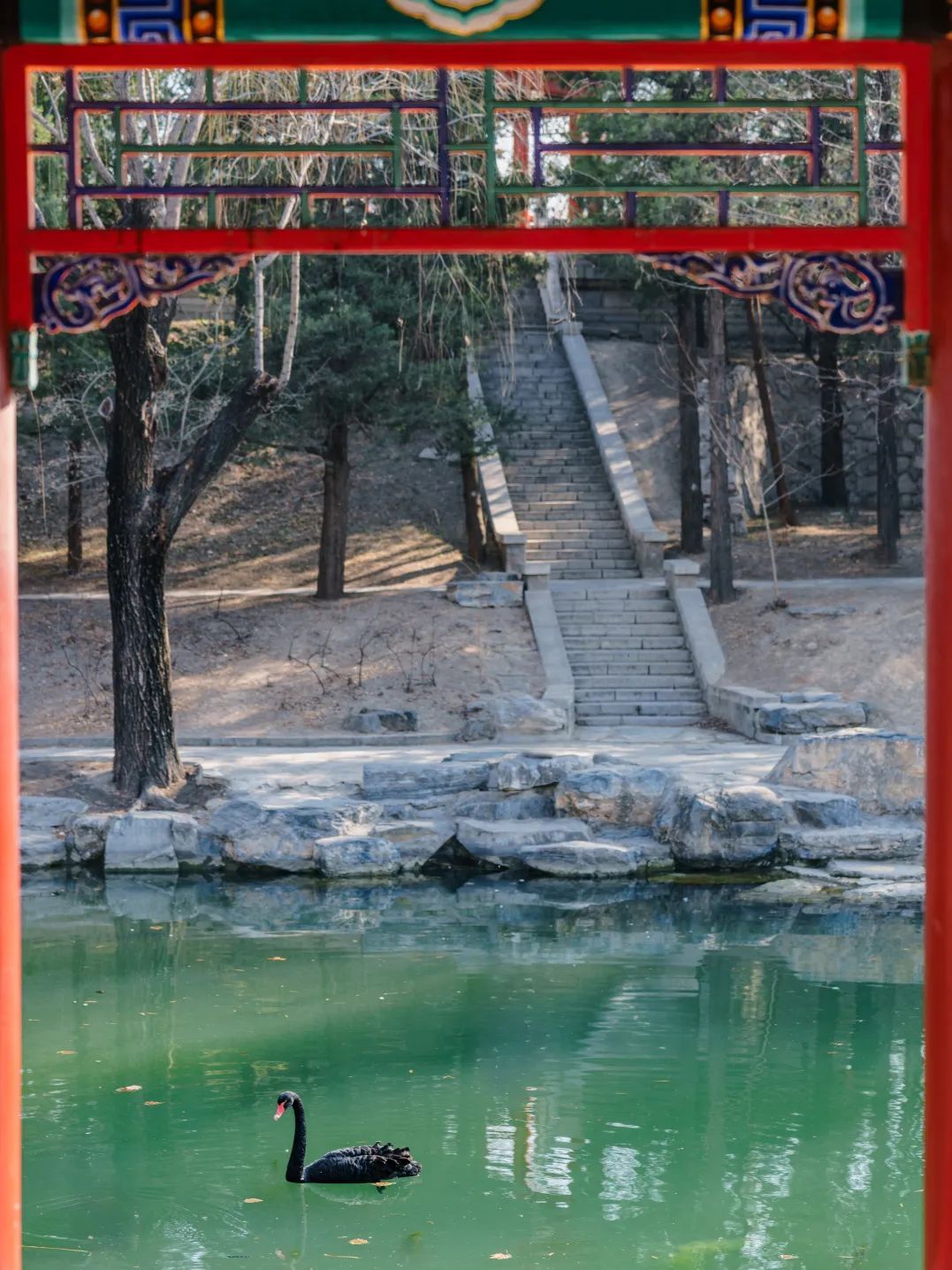 喙的赤红辉映亭榭黛绿