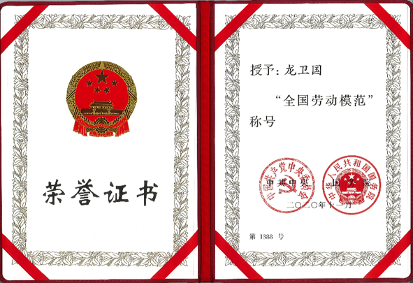 龙卫国的全国劳动模范证书干一事终一生