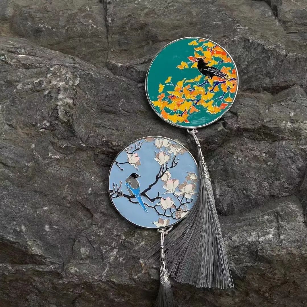 记忆里妈妈总是喜欢照镜子,于是萌生了亲手为妈妈做一面梳妆镜的想法,希望妈妈能把子女的祝福时刻都带在身边。特别选取了喜鹊、玉兰、乌鸦、银杏等有着吉祥美好寓意的设计元素,通过手雕蜡模、打磨抛光、内填珐琅等工艺制作成这两面小巧的梳妆镜。都说儿女身上少不了妈妈的影子,我们也想通过镜子找回从妈妈身上溜走的温柔岁月。