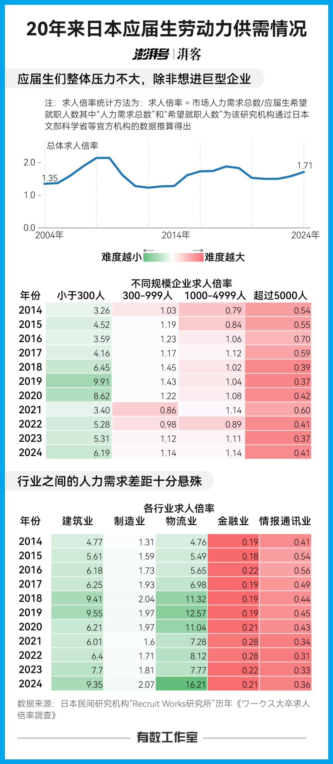 第一。日本应届生除非想进超过5000人的大企业或金融业IT业,不然工作还是很好找的,总体求人倍率达到了1.7,即1.7个岗位有1个人应聘。