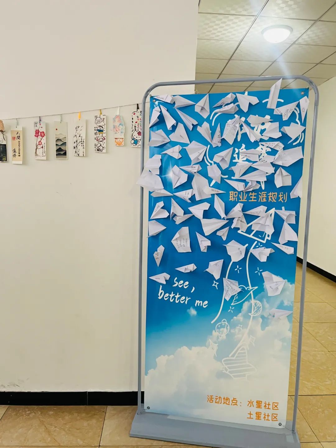 三、创作职业生涯发展规划飞翔海报活动之前在水星社区和土星社区的公告栏、活动室等显著位置张贴活动海报,向学生宣传写下职业生涯目标并粘贴职业发展纸飞机的活动内容和意义,吸引学生参与。活动开始后安排工作人员在现场引导学生思考自己的职业生涯目标,可以是短期的学业目标、技能提升目标,也可以是长期的理想职业方向等。让学生将目标写在折成纸飞机形状的纸张上。同时在社区内张贴大幅的职业发展规划海报,海报上绘制飞翔的图案。之后,让学生将写有目标的纸飞机粘贴在海报大树上,象征着放飞梦想、向着目标前行,使活动充满趣味和意义。