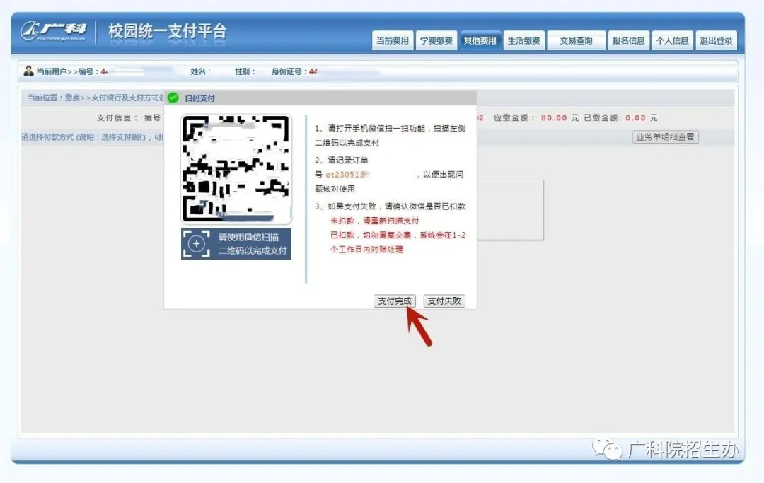 6、用微信扫描支付界面出现的二维码,完成支付以后点击支付完成即可。