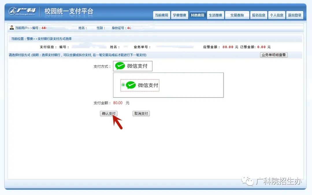 5、进入交费界面,系统采用微信支付,点击确认支付;