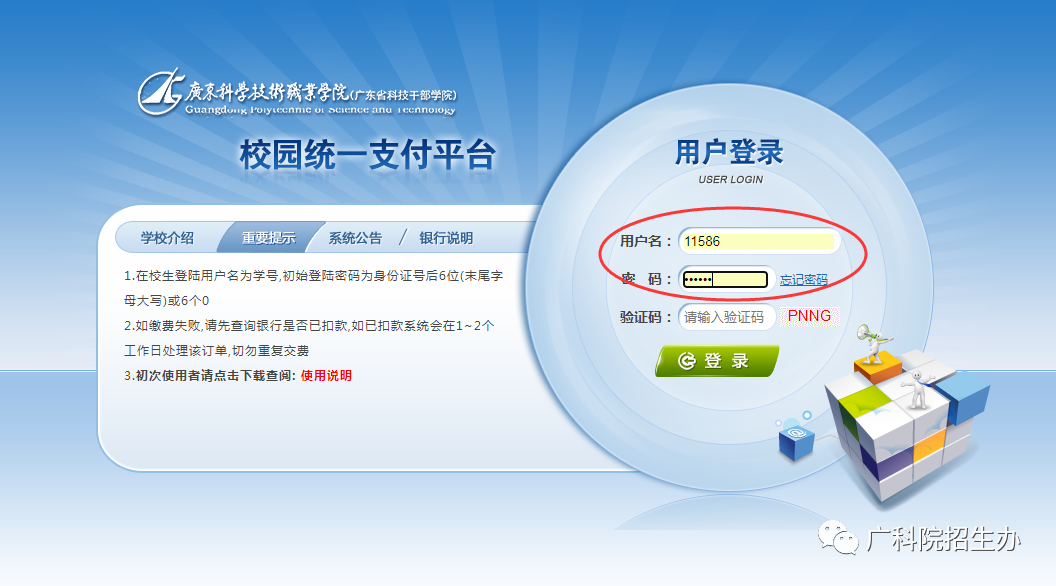 1、登录http://cwwx.gdit.edu.cn/xysf/,统一支付平台网址,输入账号密码后登录(考生默认账号为身份证号,默认密码000000);