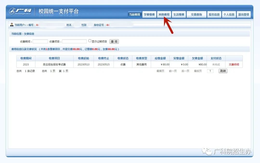 2、进入统一支付平台以后点击其他费用按钮;