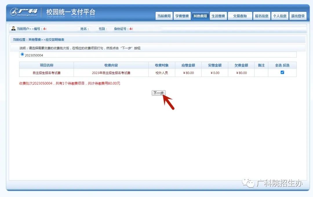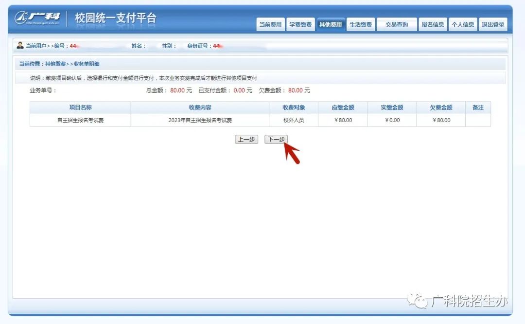 4、核对个人信息、缴费项目名称与缴费金额是否正确,确认无误后点击下一步;自主招生(普通现代学徒制试点)考核科目为“文化素质”和“职业技能”,一共80元/生。
