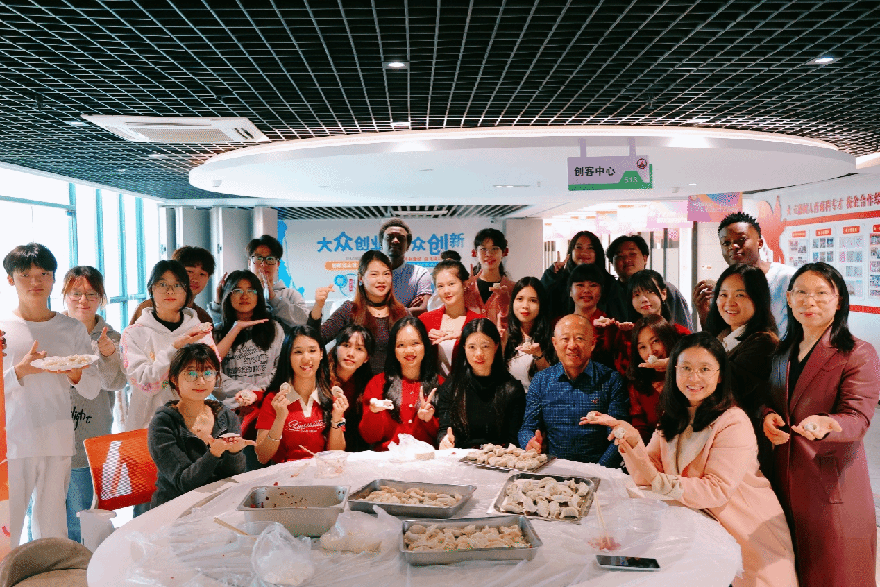 在2025年元旦来临之际,财经商贸学院在精业楼5楼举办以“饺香传情庆元旦,中外学子共团圆”为主题的迎新年活动。学院院长郭士富、学生工作负责人杨令、相关教师代表及学生志愿者与来自印尼、坦桑尼亚、乍得等国家的留学生齐聚一堂,共同迎接新年的到来。