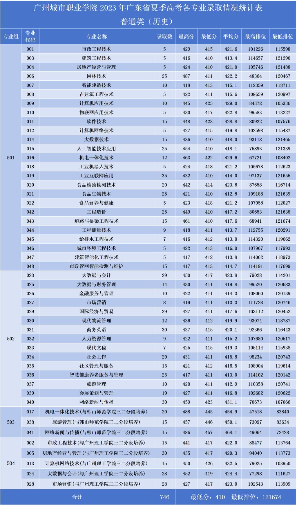 广州城市职业学院2023年广东省夏季高考各专业录取情况一览表-普通类(历史)