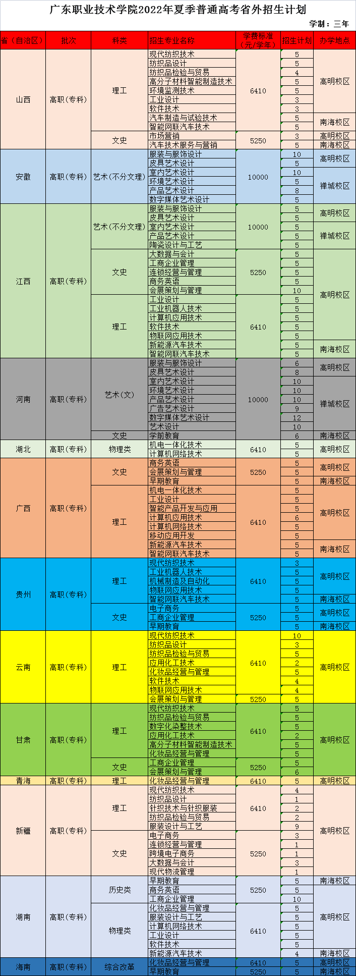 广东职业技术学院2022年夏季普通高考省外招生计划及专业设置安排