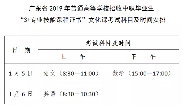 符合广东省普通高考报名条件、且获得专业技能课程证书的中等职业学校(含职业高中、成人中专、技工学校)的应届毕业生和往届毕业生注意啦!广东省2019年普通高等学校招收中职毕业生“3+专业技能课程证书”文化课考试科目及时间安排定啦↓↓