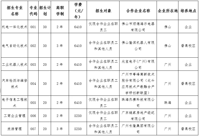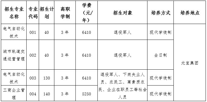 3.001电气自动化技术、003电气自动化技术、004工商企业管理专业与光宝集团合作开展现代学徒制试点,招生招工同步,正式录取前需与光宝集团签订劳动合同。