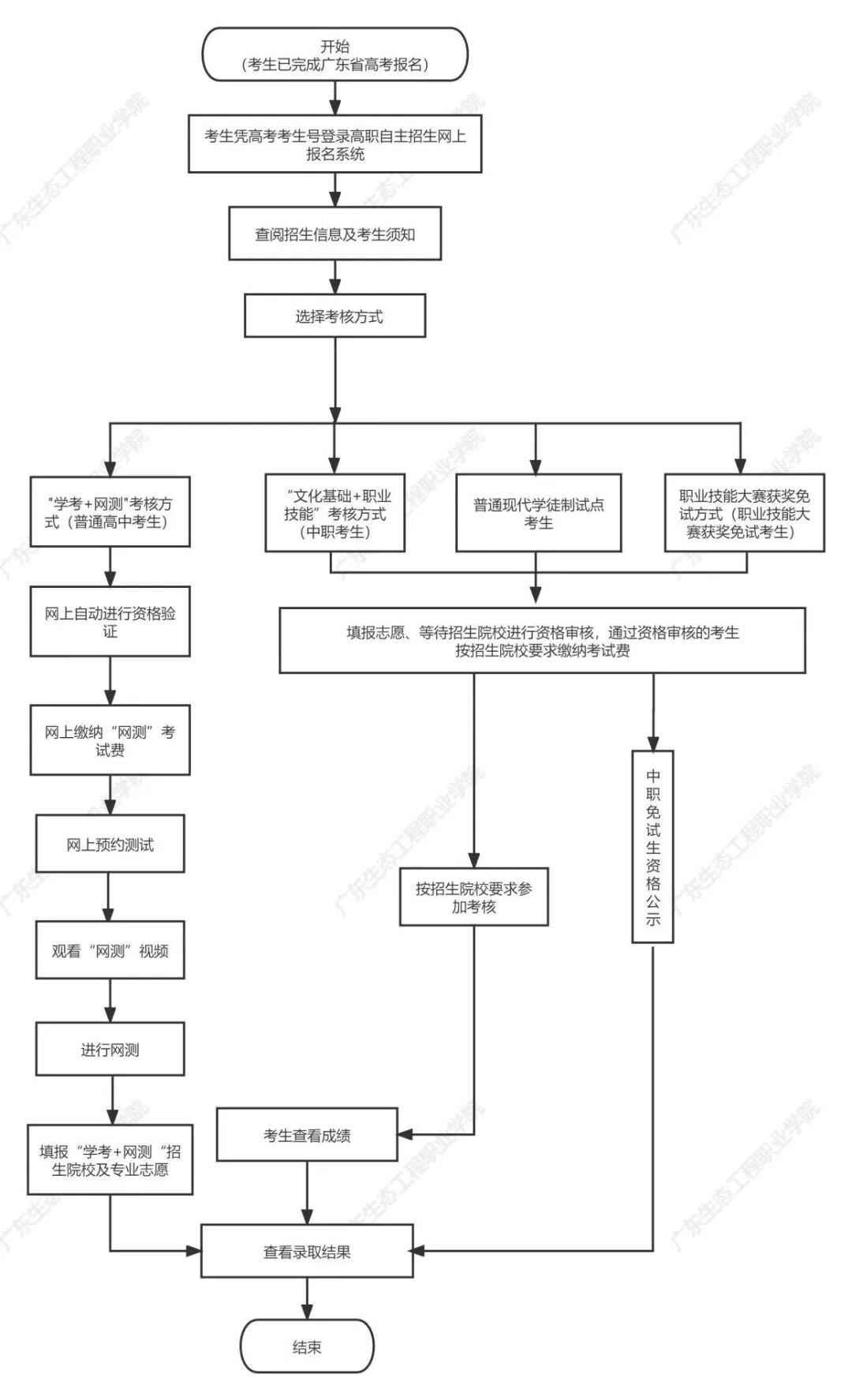 广东省高职自主招生录取实行网上录取,按照“学校负责、招办监督”原则进行。在符合高职自主招生报考条件、考核成绩达到我校划定的各招生专业录取最低分数线的考生中,根据考生志愿优先,总分成绩从高到低,考生总分相同时,按职业技能考核成绩从高分到低分择优录取。