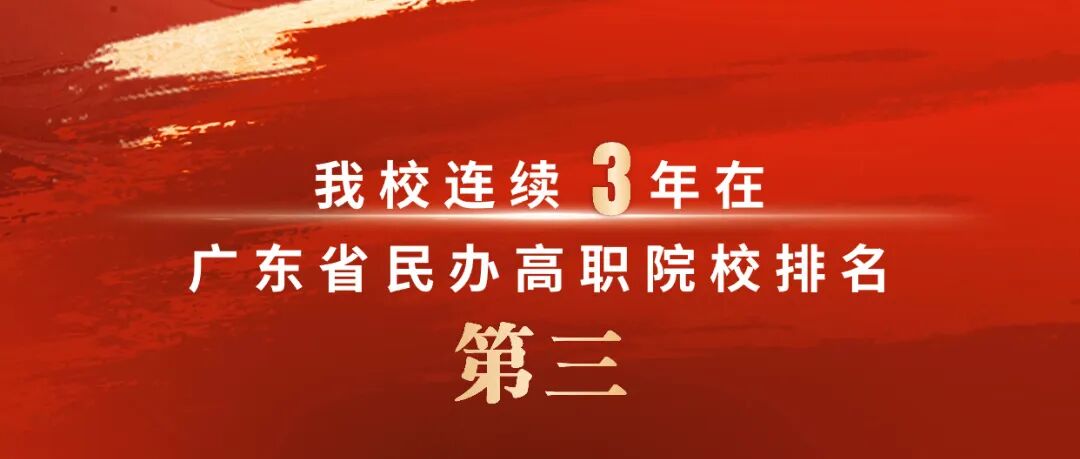 在2024年“金平果排行榜”(又称中平榜)的高职高专院校综合竞争力排名中,我校连续三年在广东省民办高职高专院校中位列第三;