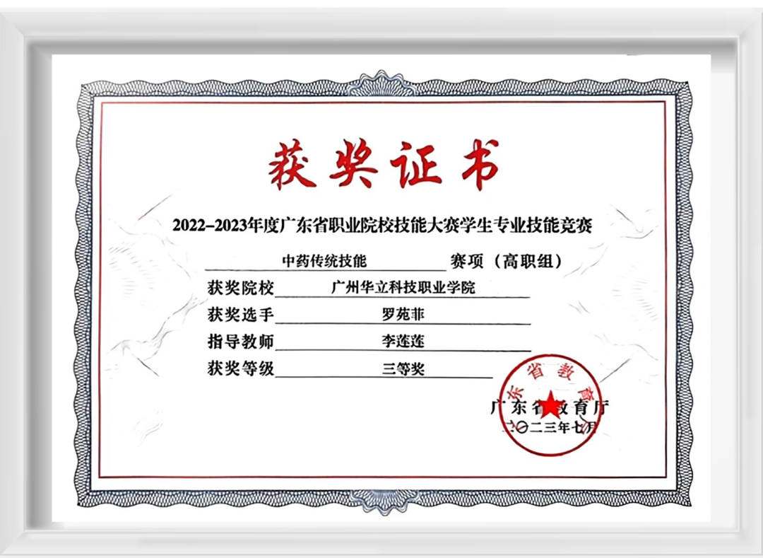 •2021-2022年度广东省职业院校技能大赛中药传统技能赛项三等奖;