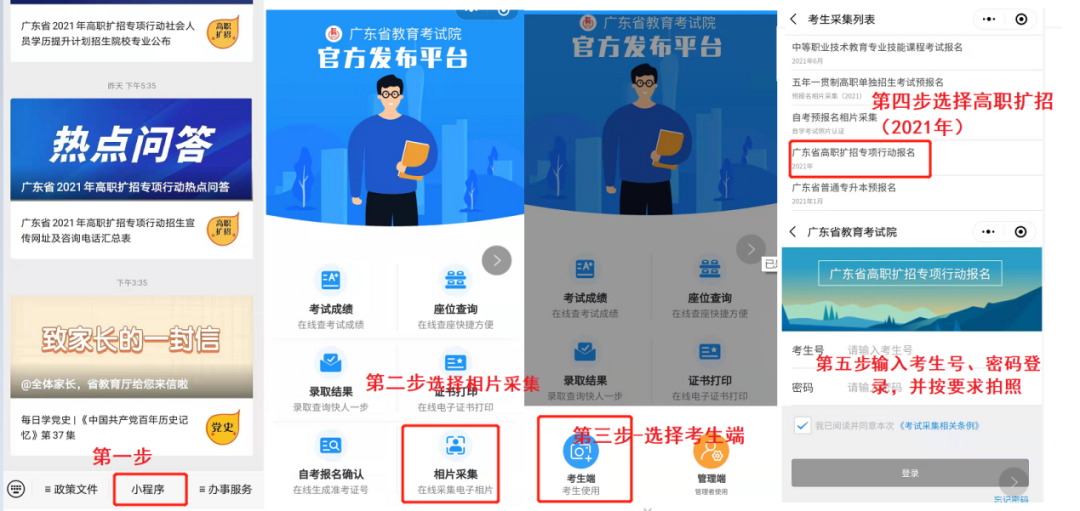 【采集照片】点击侧边栏【2021年高职扩招】,进入预报名页面,点击【采集照片】跳转到采集页面。
