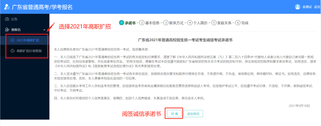 二、【阅读承诺书】考生仔细阅读“广东省2021年普通高校招生统一考试考生诚信考试承诺书”后,点击“同意”按钮,进入“基本信息”模块。