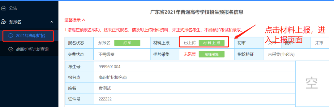 八、【上传资料】完成预报名信息提交后,点击侧边栏【2021年高职扩招】,进入预报名页面,进行资料上传。注意:考生完成所有材料上报后,系统显示为“已上传”,院校才会对资料进行审核