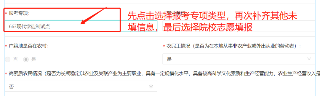 三、【基本信息和志愿信息】根据自身情况填写报名信息后,先选择报考专项,再次补齐其他未填信息,最后选择院校志愿填报,点击下一步,进行“联系方式”模块。