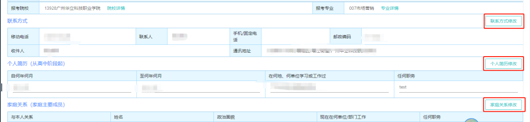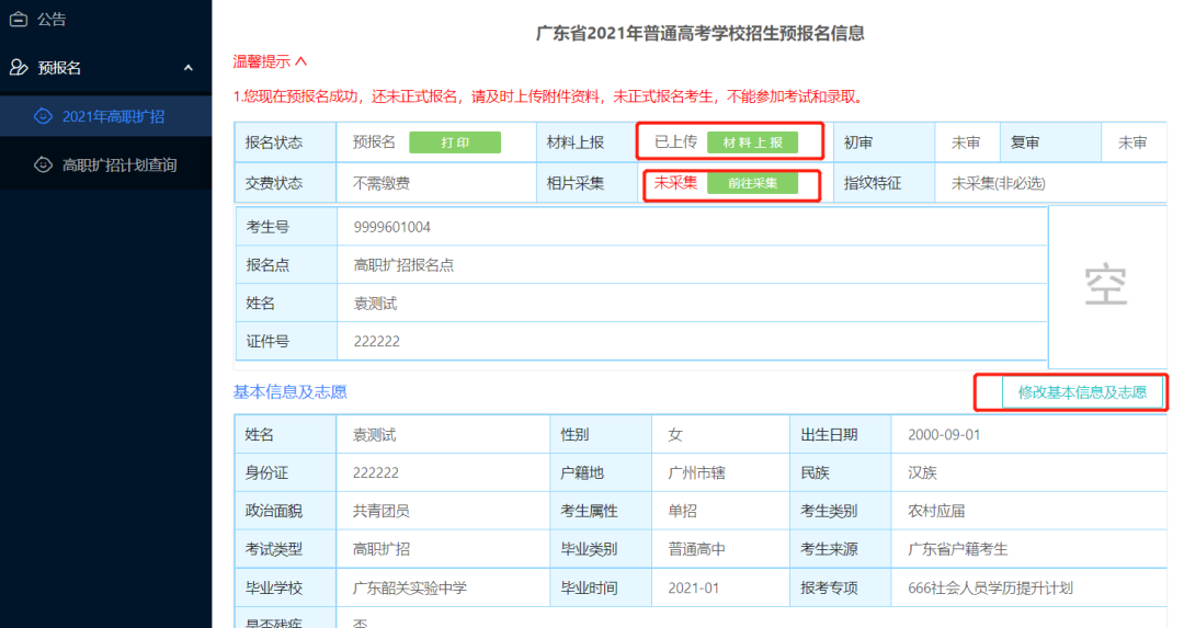 【修改信息】点击侧边栏【2021年高职扩招】,进入预报名页面,点击各栏目下的修改信息,可以进行信息修改,修改完成后点击“保存修改”。