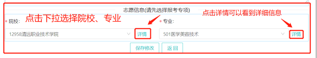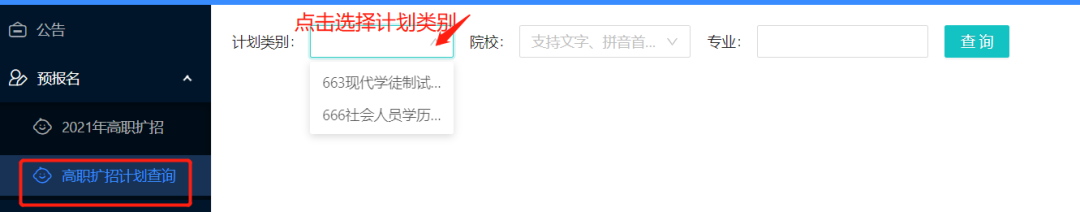 选择院校志愿填报。考生选择1所学校,1个专业志愿后点击“保存修改”,进入“填写联系方式”。计划信息可通过侧边栏“高职扩招计划查询”进入查询页面。