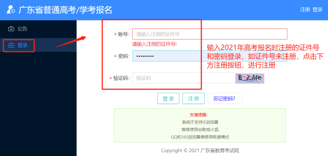 一、【登录】考生登录广东省高职扩招报名及志愿填报系统(https://pg.eeagd.edu.cn/ks),输入证件号、密码及验证码登录系统。(没有参加2021年高考报名的考生,需注册后再登录)。
