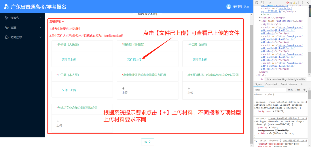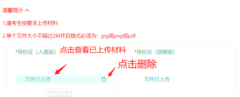 考生按要求和提示上传材料,上传完成后可点击查看。