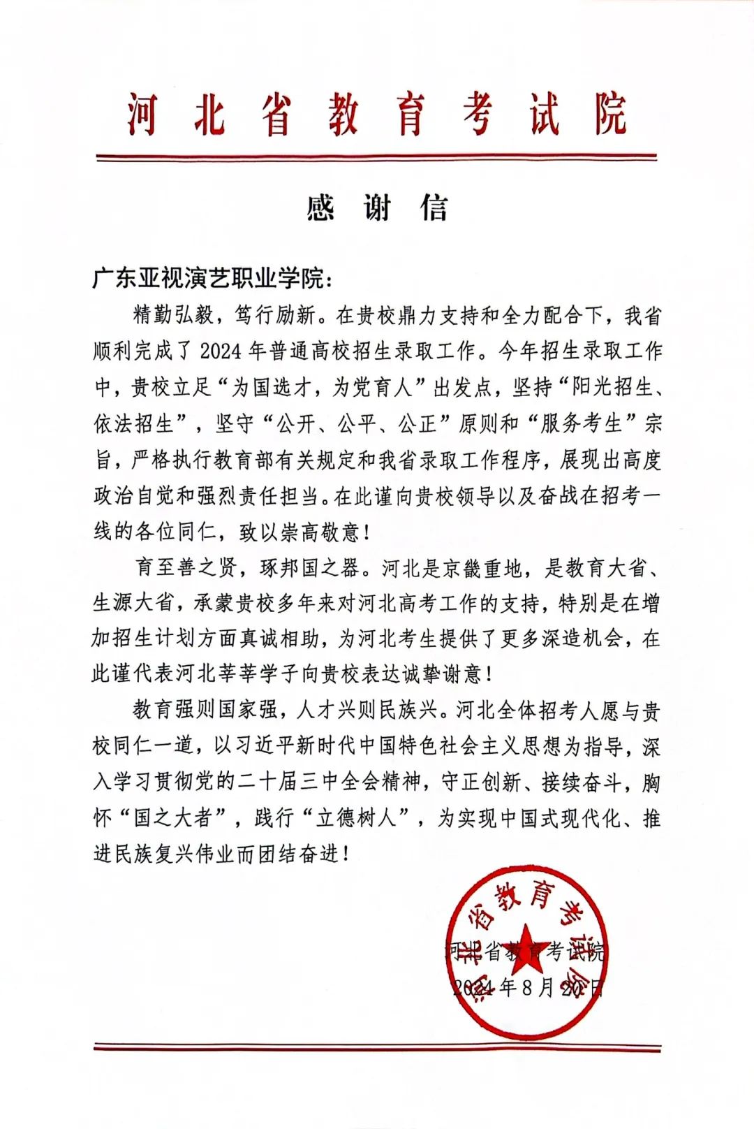河北省教育考试院于2024年8月20日向我校发来感谢信,表彰我校在2024年度普通高等学校招生录取工作中所作出的显著贡献和坚定支持。
