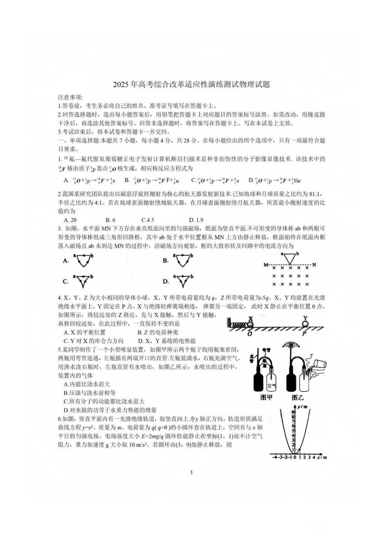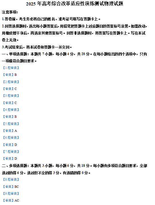四川2025年高考综合改革适应性演练测试物理试题
