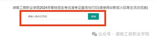 方式一:报考湖南工商职业学院的一志愿考生(已缴费报名),电脑页面使用360浏览器极速模式或谷歌浏览器等主流浏览器登录湖南工商职业学院2024年单独招生考试准考证查询与打印页面,网址为: